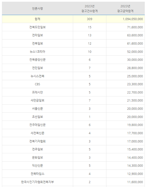 *전북 대변인실 2023년 행정 광고 집행 내역 (단위 : 원/ 출처 : 대변인실) - CBS의 경우 본사/지역국 여부가 명확하지 않아 대변인실에서 기재한 그대로 분류함.