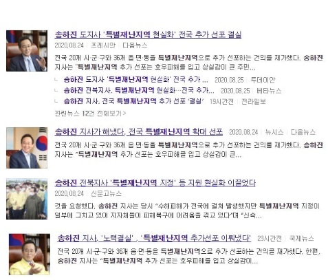 그러나 전북지역 언론들은 '송하진 도지사 특별재난지역 현실화 전국 추가 선포 결실', '송하진 지사가 해냈다, 전국 특별재난지역 확대 선포', '송하진 지사, 특별재난지역 추가 선포 ‘결실’' 등 화려한 수식어가 첨가된 제목의 기사들이 검색되었다.