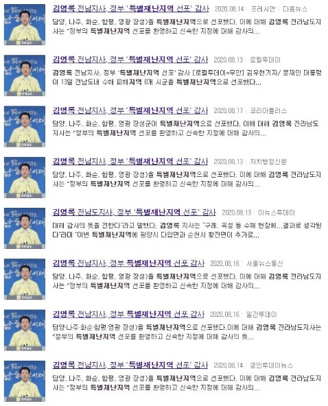 이에 대해 전남지역 언론들은 다음날 ‘김영록 전남지사, 정부 ‘특별재난지역 선포’ 감사’란 제목의 기사들이 포털에서 많이 검색되었다. 주로 통신사와 인터넷 언론사들이 검색에 올랐다.