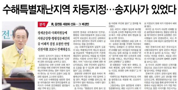 이 신문은 지난 25일에도 ‘수해특별재난지역 차등지정··· 송지사가 있었다’(2면)란 제목의 기사에서 송 지사를 높이 평가하며 칭찬했다.