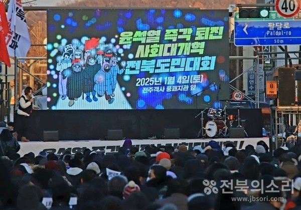 윤석열퇴진 전북운동본부는 새해 첫 주말인 4일 오후 4시부터 전주시 풍패지관(객사) 앞에서 집회를 열고 ‘윤석열 체포와 구속’, ‘국민의힘 해체’, ‘내란 동조세력 체포’ 등을 촉구했다.