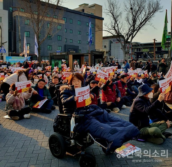 한참 동안 구호를 함께 외치다 집회 참가자 수를 세어보니 어느새 거리에는 얼추 1,000여명이 넘는 시민들이 벌써 자리를 차지하고 앉아 있었다. 맨 앞줄에 앉아 있던 한 여성 지방의원이 손을 흔들어 보이며 아는 체를 했다. 그러자 그 옆에 함께 모여 있던 시민사회단체 활동가들도 눈인사를 했다. 그들 중에는 장애인단체 관계자도 휠체어에 앉아 기다리고 있었다.