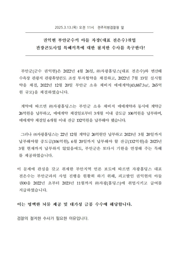 이후 진보당 김제부안지역위원회와 전주시민회가 3월 13일 전북지방검찰청 앞에서 부안군 관광콘도사업 특혜 의혹에 대한 철저한 수사를 촉구하는 기자회견을 예고했습니다. 권익현 부안군수 아들의 채용 논란과 관련해 “이는 명백한 뇌물 제공 및 대가성 금품 수수에 해당한다.”라고 주장했습니다.