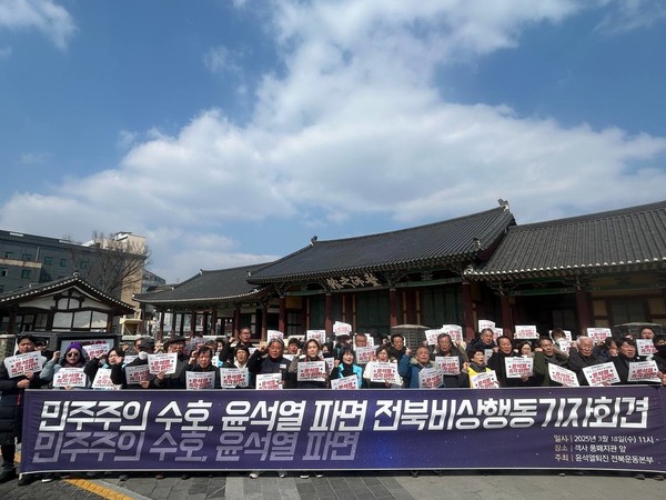 윤석열 대통령의 탄핵 심판 선고가 기약 없이 지체되고 있는 가운데 신속한 선고를 촉구하는 목소리가 도내에서도 거세게 일고 있다. 전북지역 80여개 시민사회단체들로 구성된 윤석열퇴진 전북운동본부는 19일 ‘민주주의 수호의 날 비상행동 기자회견’을 열고 “헌법재판소는 내란 수괴 윤석열을 즉각 파면하라”며 “더는 선고를 미룰 일이 아니다”고 목소리를 높였다.