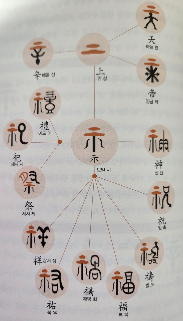 하늘을 경배하는 의미의 제사사祀는 하늘(示)에 인간(아기 巳)의 화복과 건강을 빌던 제천의식에서 유래한 글자다. 주역 계사전에서 "역이란 다른 게 아니다. 만물을 열어서 일을 성사시키는 하늘의 도를 보여주는示 것이다.( 易, 無他也 示開物成務之道也.)"는 취지도 같다. 하늘(示에) 제사하고 복을 빌고 흉사를 막기위해 기도하는 일(빌축祝)은 형님, 우두머리(부족장兄)가 할 일이다. 그래서 족장들은 천제단 고인돌을 세웠으리라. 하늘에서 내려주시는 복(福)은 하늘(示)에서 항아리(畐)를 가득 채운 상형이니 풍년농사다. 재앙화(禍)는 하늘(示)에서 생선 가시(咼)처럼 쭉정이를 내려주는 모양이므로 흉년이다.