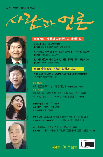 이에 <사람과 언론> 봄호(통권 4호)는 ‘제왕적 지배문화와 갑질현상’을 특집 주제로 정하고 우리 사회에 오랫동안 뿌리를 내리며 지배문화로 자리해 온 갑질현상의 실체와 이로 인한 부작용, 개선방향을 짚어보았다. 아울러 ‘촛불정부 3년차, 성찰과 남은 과제’란 특별 기획을 통해 촛불혁명으로 탄생한 문재인 정부 출범 3주년을 맞는 한국사회는 왜 여전히 소요하기 그지없는지, 적폐청산을 위해 숨 가쁘게 펼쳐온 개혁정책의 결과는 무엇인지, 밝고 투명한 미래를 위해 무엇을 해야 할 것인지 등에 대해 진지한 고민과 대안을 담았다.
