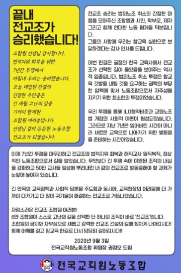 조합원들의 마음을 모은 현장의 실천에서부터 각계각층의 릴레이 지지 선언, 국제사회의 관심과 촉구에 이르기까지 전교조는 힘차게 싸워왔다. 해고된 동료와 함께 노동조합의 자주성을 지키기 위해 고난의 길을 선택했던 조합원과 전교조를 끝까지 응원하며 지지해 준 시민들이 있었기에 오늘의 승리가 가능했다. 함께 해주신 모든 분께 진심으로 감사를 전하며 전교조는 참교육 실천으로 보답할 것을 약속드린다.
