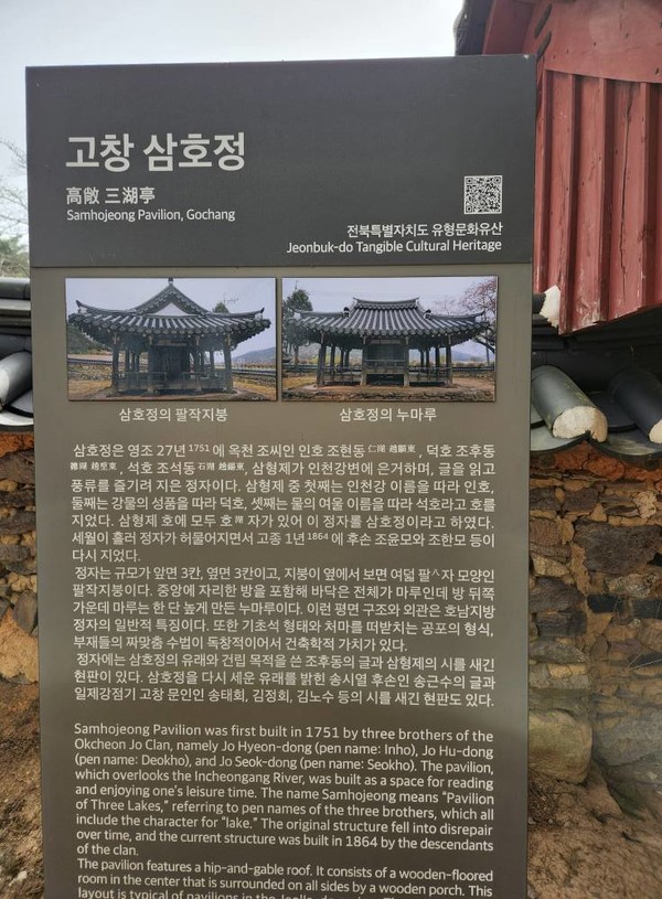 한 핏줄 형제지만 때로는 절친보다 더 친근하고, 동지보다 더 뜨거운 가슴을 공유했던 우정과 동기애를 나눈 삼형제 이야기가 곳곳에 새겨진 정자다. 인천강과 삼호정 주변의 산수절경도 빼어나지만, 삼형제의 고결한 사람향기가 더욱 아름다운 기억으로 남아있다. 창건당시 1751년(신묘년)의 <삼호정기> 기문은 둘째인 덕호 조후동이 지었다. 1백여년 뒤 다시 중수한 삼호의 후손 조윤모, 조한모의 간청으로 좌의정 송근수가 지은 1864년(갑자년) <삼호정기> 기문도 함께 걸려 내력을 말해준다.