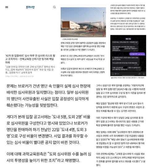 [프레시안] ‘41억 원 입찰비리’ 심사 하루 전 심사위 리스트 팔고 조작까지... 전북교육청 산하기관 뒷거래 백일하에(4/29, 김하늘) - 현재 삭제