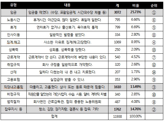 “갑질현상, 임금과 잡무지시, 직장 내 괴롭힘이 절반 이상 차지”