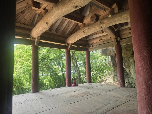 그런데 이 정자에는 현판이 걸려 있지 않다. 왜 그런가?, 10여년 전에 이 곳에 놀러 왔던 사람들이 현판을 뜯어내어 불쏘시개로 했다는 것이다. 현판도 걸려 있지 않은 쌍계루 뒤에는 수선루처럼 샘물이 흘러나와서 졸졸 흐르고 그 뒤편 바위벽에는 쌍계 석문이라는 글씨와 이곳을 찾았던 사람들의 이름들이 새겨져 있고, 고색창연하게 이끼가 끼어 그 세월을 증명해주고 있다.