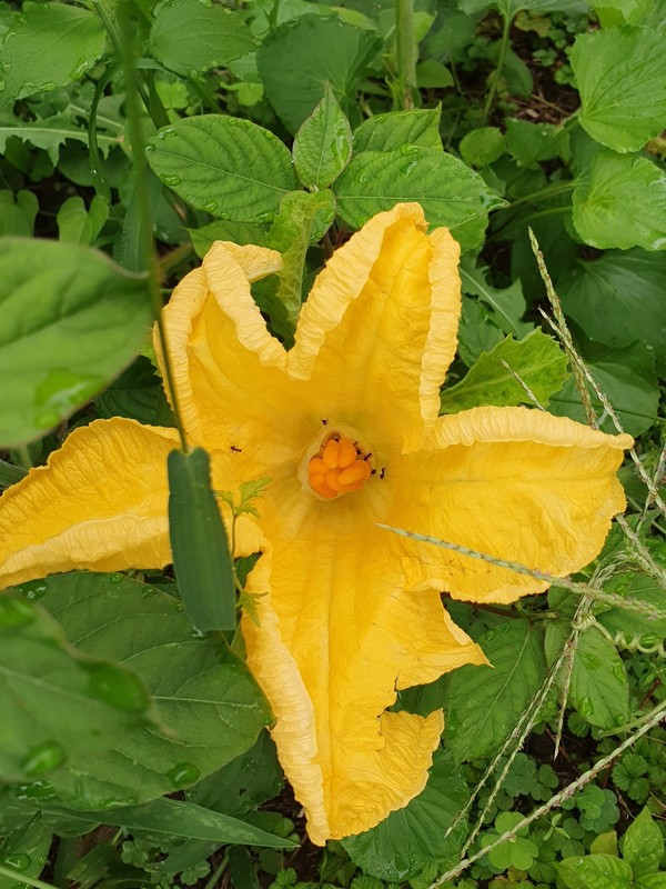 호박 넝쿨은 꽃밭으로 뻗어 나가 다른 것들 위로 무성한데 호박은 안 열리고 호박꽃 속에는 개미들만 열심히 움직이고 있네요.
