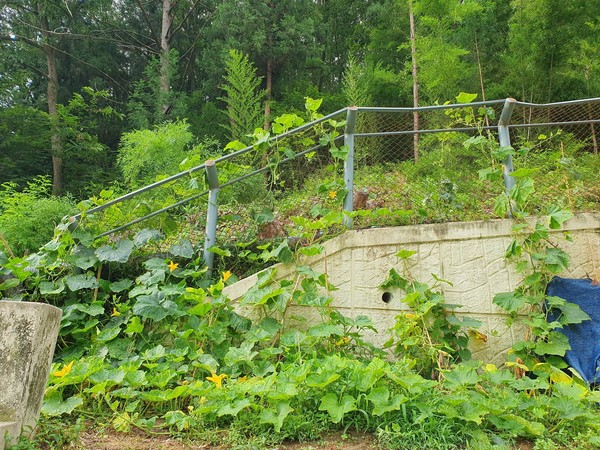 5월 인지 6월 어느날 우리 아파트 놀이터 담장 아래 여기 저기 호박이 심어진 것을 보았습니다. 평소에 관리사무소장은 입주민 마음대로 아무거나 심으면 안된다고 했는데 누가 심었는지 궁금했습니다.