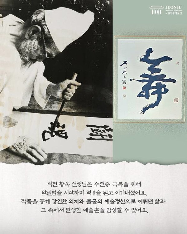 석전 선생이 가신 날 부고 뉴스와 함께, 손자 황방연의 제5회 서예대전 대상수상 소식이 언론에 동시에 실렸다. 기이한 인연이다. 마치 조부의 신필을 손자에게 물려주는 기획된 시나리오 같은 하늘의 조화였다. 실질적 장손자인 성재 황방연(醒齋 黃邦衍 1954~)은 조부의 필력을 승계한 현대서예를 대표하는 작가다. 조부 황욱 선생의 관심 속에서 서예를 시작했으나, 오른 팔의 마비로 시련을 겪기도 했다. 그후 여초 김충현 선생의 영향으로 서법을 체계적으로 연구하고, 일랑 이종상 선생께 문인화 공부를 하는 등 연마를 거듭했다. 서예, 전각, 서각을 아우르는 전시회와 화려한 수상이력을 쌓은 서예계의 중추적 인물로 조부 석전의 서예 예술세계를 잇고 있다.