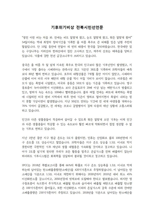 다음은 전북녹색연합이 홈페이지를 통해 공개한 기후위기비상 전북시민선언문이다.