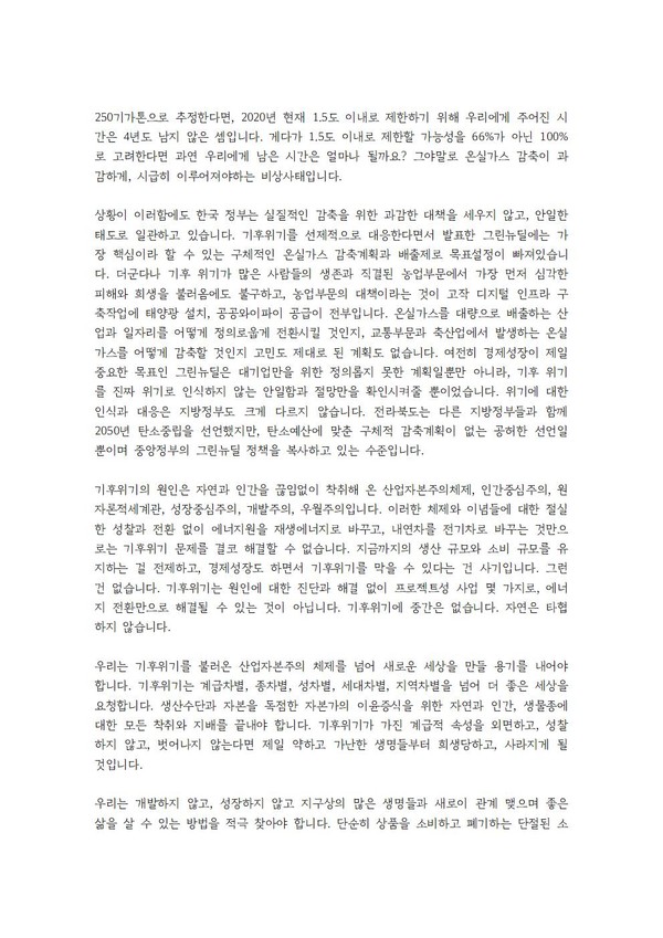 기후 문제는 개인의 노력도 중요하지만 기후위기가 사회문제, 인류 생존의 문제, 다른 생명들의 생존 문제라는 것을 인식하고 다 같이 사는 세상을 기대하며 많은 자리에서 행동하자는 것에 뜻을 모았다.
