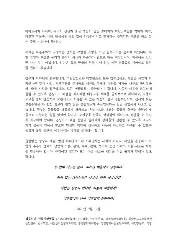 이러한 상황에서 청소년, 환경, 노동, 농업, 인권, 종교, 과학 등 200여개 사회단체의 연대기구인 기후위기 비상행동이 9월 한 달간의 기후비상 집중 행동 일환으로 지난 12일 전국 동시다발 행동을 실시했다.