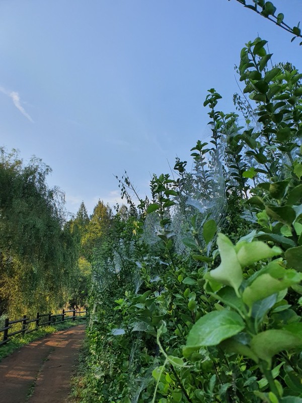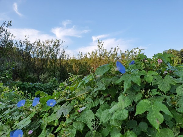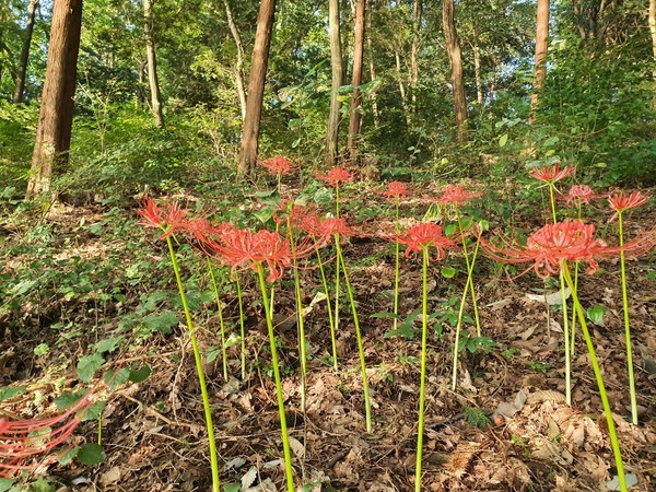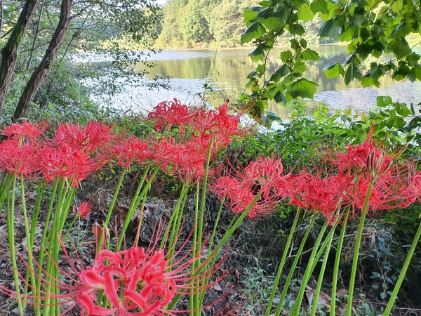 붉은 상사화 무리들이 줄지어 늘어선 산책로, 남빛 하늘, 선선한 공기를 담은 맑은 호수의 풍경들이 '호올로 시대'를 짊어지고 사는 인간들을 위로해 주는 듯하다.