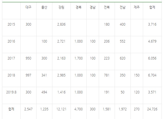 #최근 5년간(2015~2019.8) 지자체별, 연도별 손실보전금 지급 현황은?