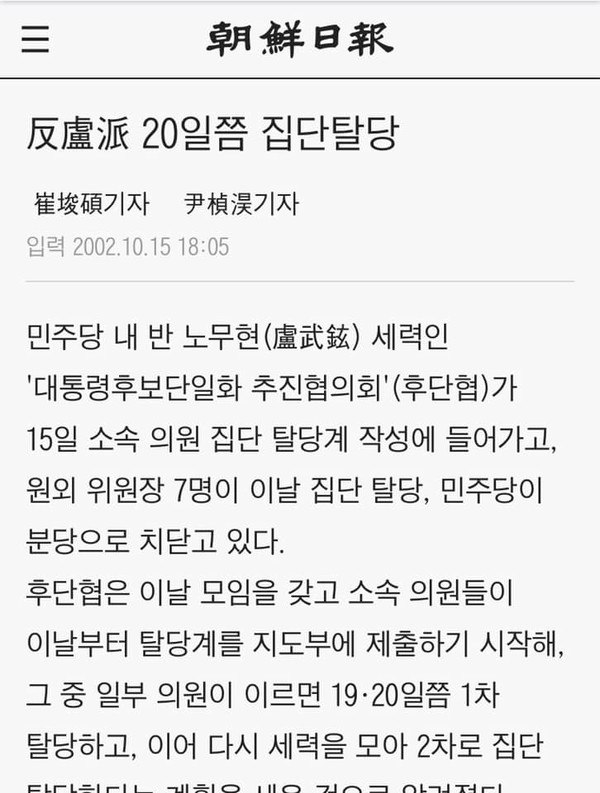 아래는 18년 전 조선일보 기사다. 노무현을 공당의 대통령 후보로 뽑아놓고 같은 당 의원인 박병석은 노무현 후보를 후보 자리에서 흔들었다.
