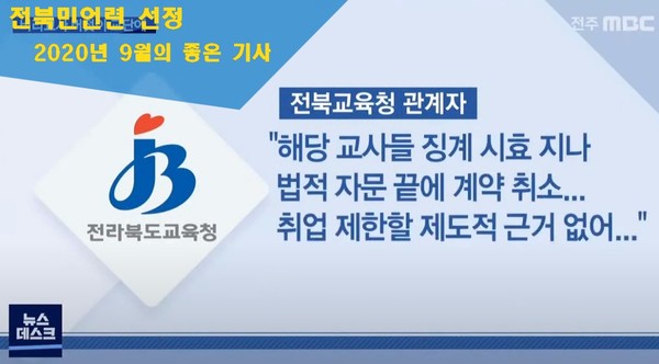 전주MBC의 '비리로 퇴출된 완산학원 교사들의 복귀 문제 지적 보도'가 '9월의 좋은 기사'에 선정됐다.