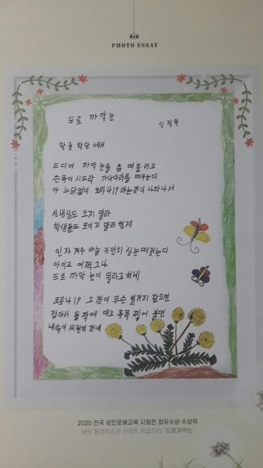남원평생학습관 신정득 학습자의 ‘도로 까막눈’이라는 작품이다. 2020 전국 성인문해교육 시화전 최우수상 수상작이다.