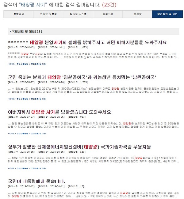 태양광 사기와 관련된 청와대 국민청원 게시판에 올라온 글들이다. 제목만 보아도 피해 규모와 사례가 늘고 있음이 읽힌다. 전북지역에 거주하는 주민이 올린 글들이 눈에 띈다.