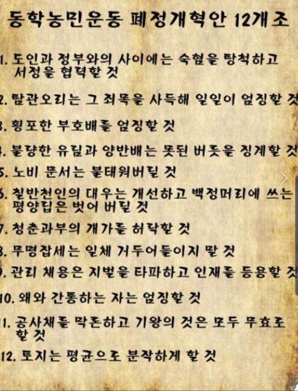 하지만 동학농민이 무력을 앞세워 전주성에 들어오자 사정이 바뀌었다. 그들의 막강한 힘을 함부로 무시할 수 없었기 때문이다. 1894년 5월 4일, 동학농민이 전주를 점령한 지 이레째 되던 날, 그들은 양호초토사(정부군 사령관) 홍계훈에게 <27개조 폐정개혁안>을 제출했다 그때 올린 폐정개혁안 가운데 다음의 13가지 항목이 후세에 전하고 있다.