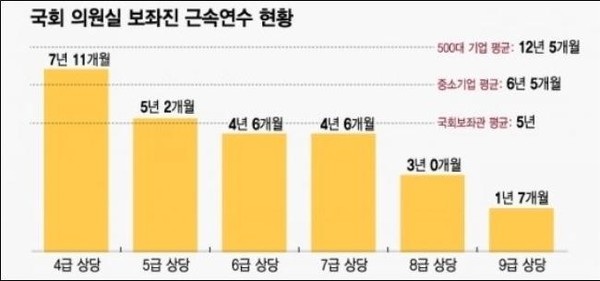 A 최근 한 조사기관에서 발표한 자료인데 국회 보좌관들의 평균 근속연수는 대략 5년인 것으로 조사됐지만 직급별로 다르다. 중소기업 평균 근속연수 6년 5개월, 대기업 평균 근속연수 12년 5개월에 비하면 적은 수치다. 그림의 자료(한보협 제공)를 보면 이해가 빠를 것이다.