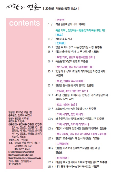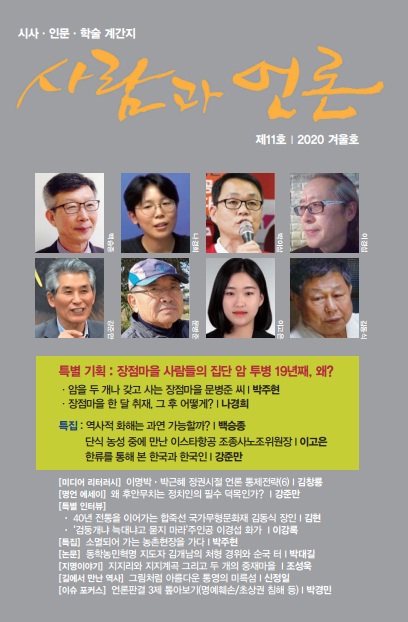 시사· 인문·학술 계간지 <사람과 언론>이 12월 1일 제11호(2020 겨울호)를 발행했다. ‘사람 사는 따뜻한 사회, 진실과 정의가 통용되는 숙의의 공론장’을 추구하는 <사람과 언론> 이번 겨울호는 익산 장점마을 주민들이 19년 째 벌이고 있는 집단 암 투병에 관한 주제를 특별기획으로 소개했다.