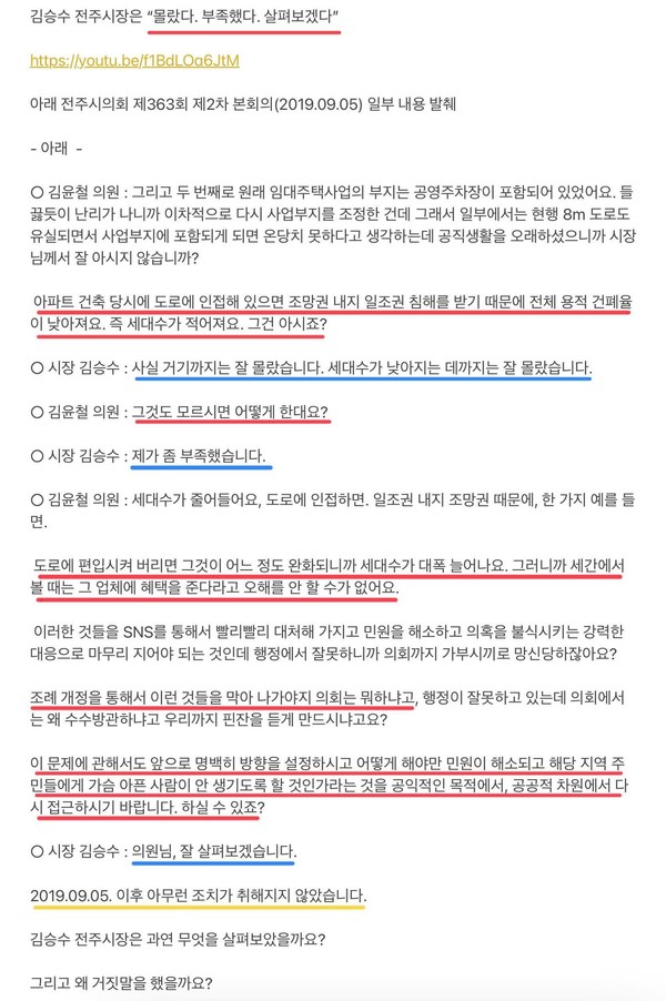 그럼에도 2019년 9월 5일 이후 아무런 조치가 취해지지 않았습니다. 이러한 질의와 답변과정 그리고 그 이후 김승수 전주시장은 과연 무엇을 살펴보았을까요? 그리고 왜 거짓말을 했을까요? 여전히 의구심이 남습니다.