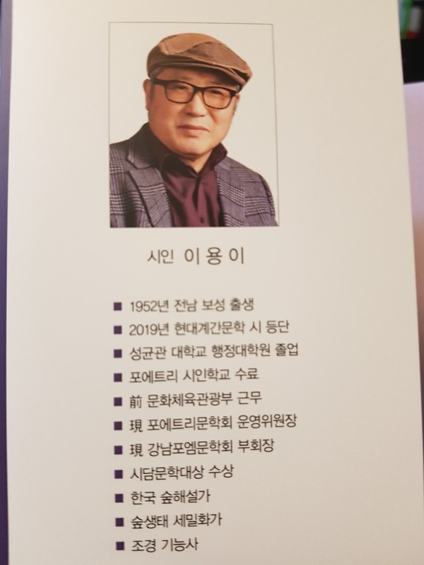 시인이자 수필가, 소설가인 이용이 시인은 예향의 고장 보성에서 태어나 초등학교 시절부터 백일장 참여 등을 통해 시를 접해왔고, 문화체육관광부 등에 근무하면서 시와의 인연의 끈을 놓지 못하고 있다가 직장 생활을 마치고 사)한국문학협회 등 여러 곳에서 시인 겸 작가로 활동하고 있다.