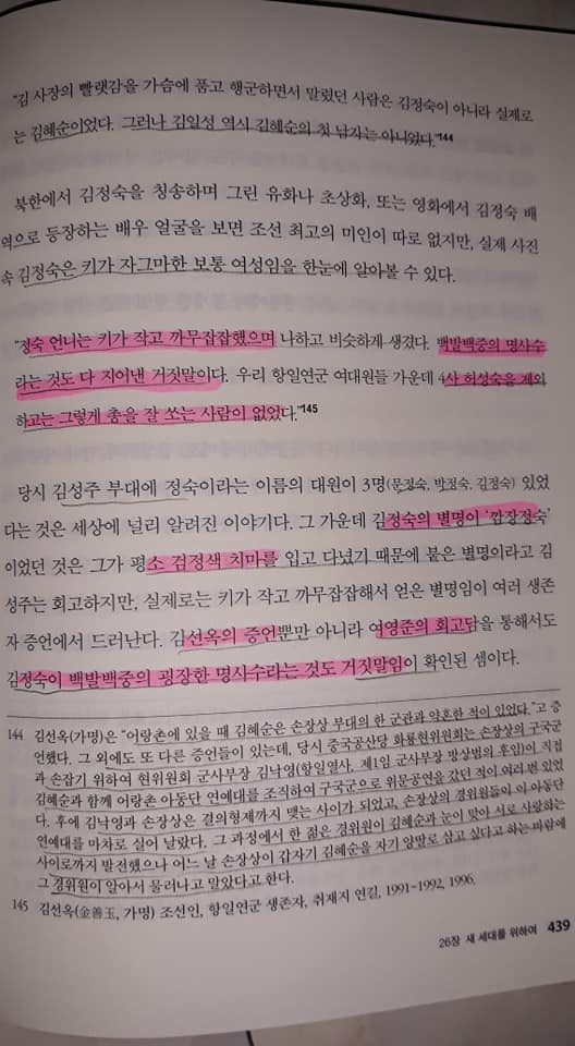 평전에 보면 김일성의 부인 김정숙에 대한 이야기가 자세하게 나온다. 이 이야기는 당시 김정숙의 두 번째 남자로 일본군이 물러가고 만주에서 남았던 여영준이란 인물이 말년에 남긴 증언이니 믿을 만한 기록인 거 같다.