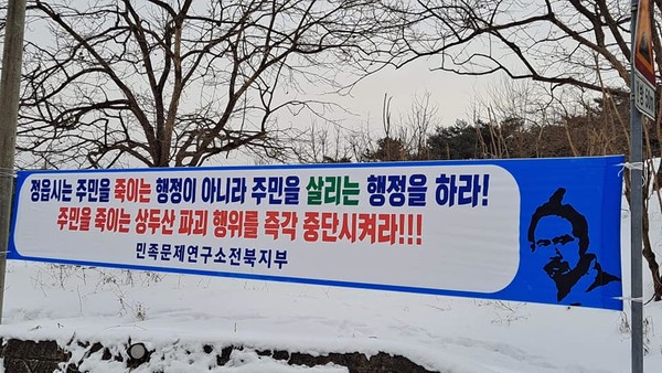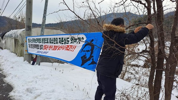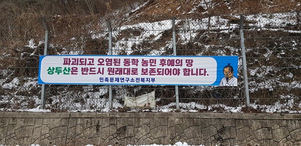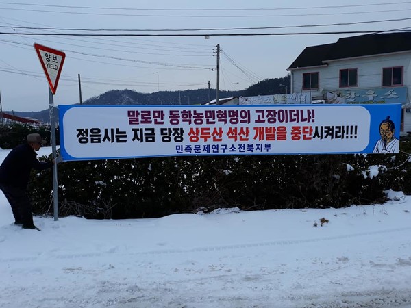 현수막을 가지고 정읍 산외면 동곡리 지금실에 다녀왔습니다. 동학농민혁명의 거두 김개남 장군이 태아난 곳이자, 혁명의 원대한 꿈을 키우며 뛰어 놀던 상두산 자락이 여러 석산 개발 업체들에 의해 처참히 무너져가기 때문입니다.