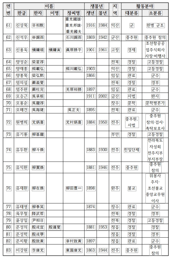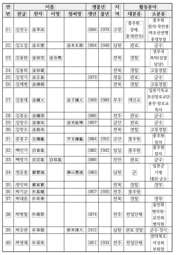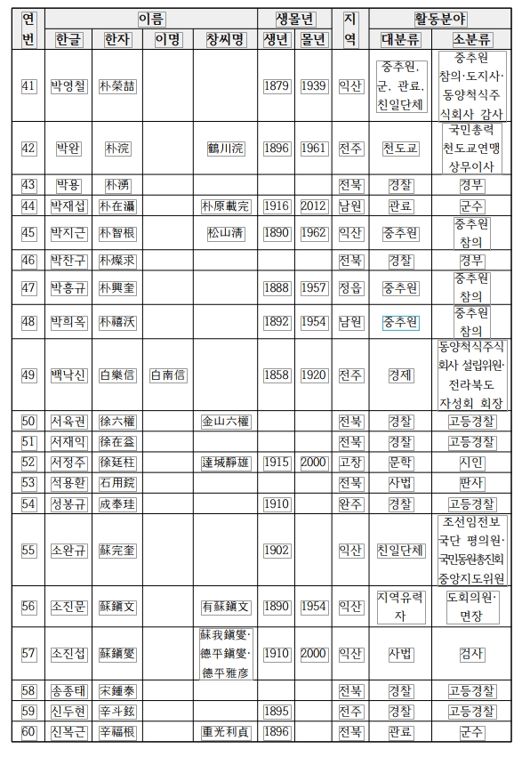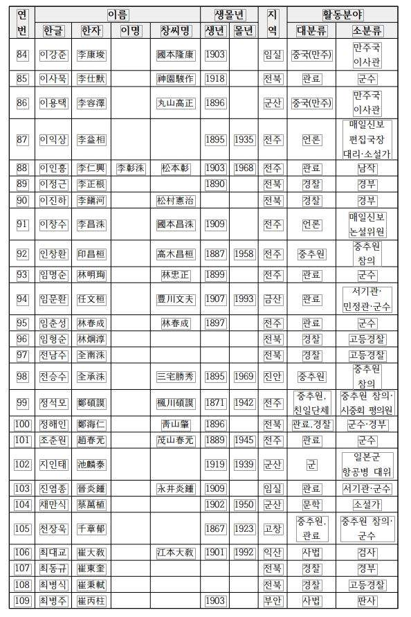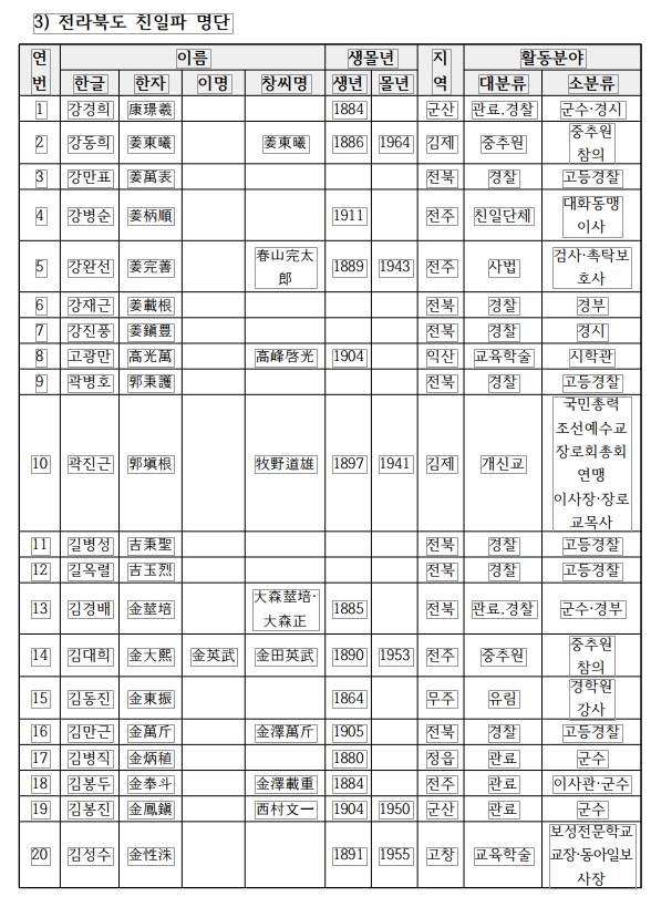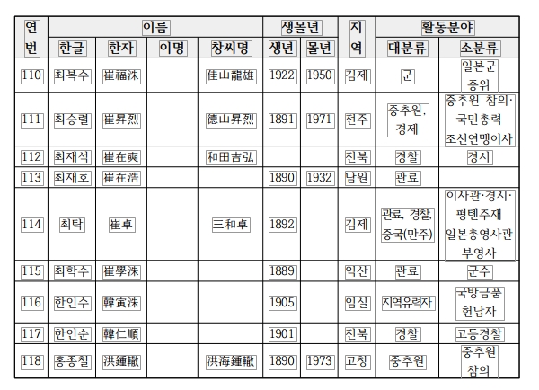 먼저 전북 출생(또는 출신) 친일파는 모두 118명으로 확정됐다. 118명의 이름, 이명(異名), 창씨명, 생몰년, 활동 분야, 상세 친일활동 내역은 아래 표와 같다. 경찰, 군수 등 관료들이 많이 눈에 띈다.