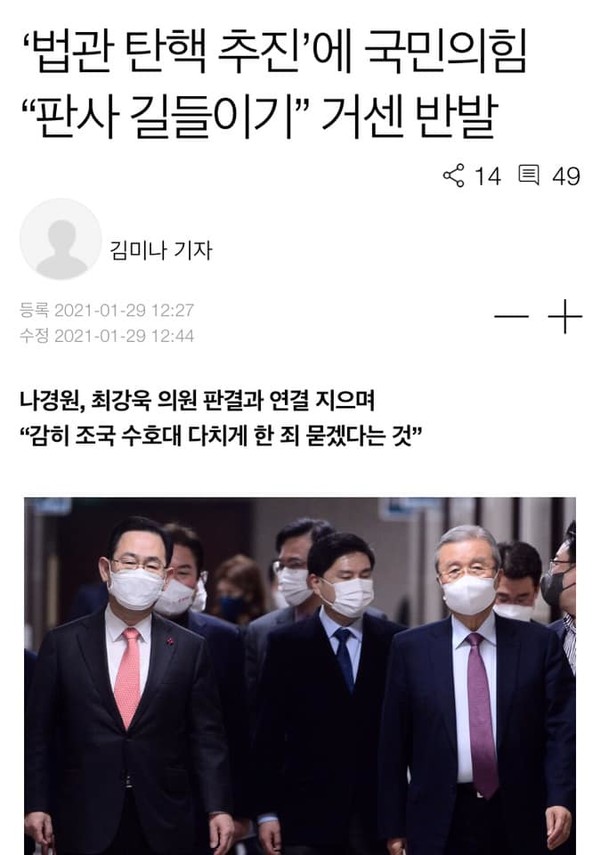 한겨레 현장 기자들 41명이 26일 성명을 통해 “‘성역’ 없이 비판의 칼날을 세웠던 한겨레는 조국 사태 이후 ‘권력’을 검증하고 비판하는 데 점점 무뎌지고 있다”며 “국장단의 어설픈 감싸기와 모호한 판단으로 ‘좋은 저널리즘’의 가치가 훼손되고 있다”고 41명이 발표했다.