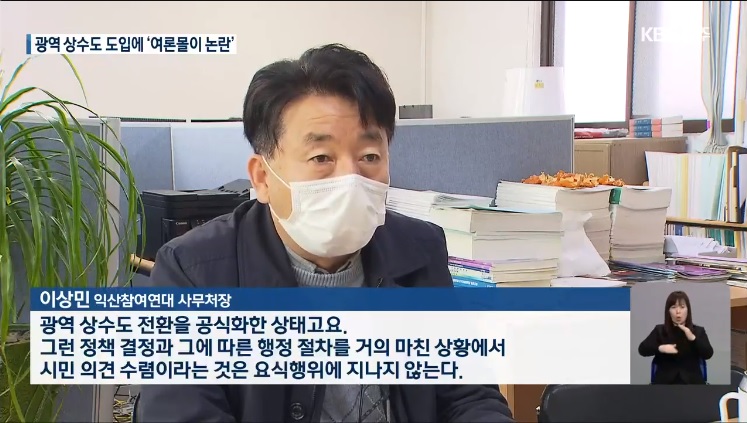 익산참여연대 이상민 사무처장은 KBS전주총국과의 인터뷰에서 익산시가 용역까지 끝내놓고 공론화를 추진하는 것은 자칫 형식적인 절차가 될 수 있다는 우려를 나타냈습니다. 또한 광역상수도 전환을 추진하는 익산시의 숨겨진 목적이 있다는 의혹을 제기했습니다.