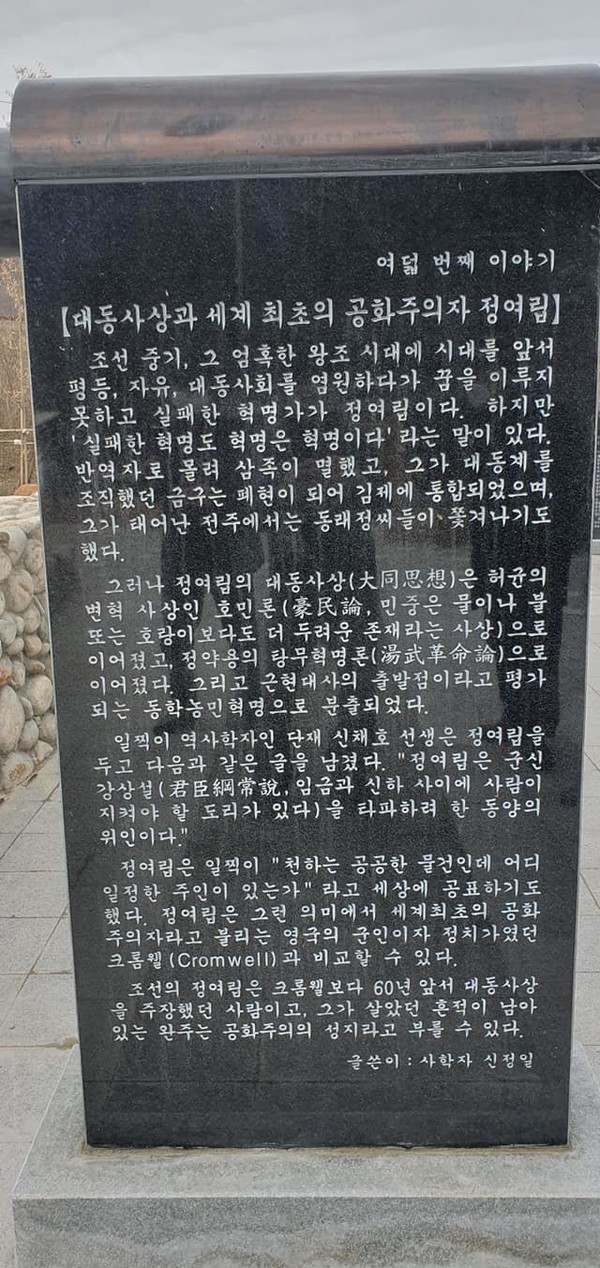 1589년에 일어난 기축옥사로 인해 조선 선비 천여 명이 죽고 그 삼년 뒤에 임진왜란이 일어났지요. 동서양당이 서로 죽이고 죽는 싸움판으로 전이한 기축옥사가 일어난 지 어언 430여 년, 단재 신채호 선생이 삼백년 뒤나 사백년 뒤 그의 유음이 전해질 것이라고 예언했던 것이 맞아서 그가 태어난 곳, 완주군 상관면 신리 파쏘 봉아래 정여립 공원이 들어섰습니다.