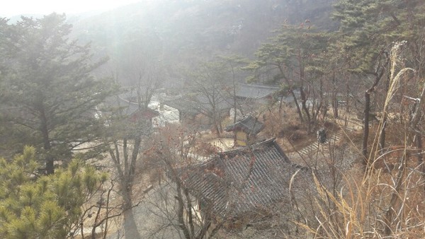 대웅전을 둘러보고 위쪽으로 더 올라갔다. 원형구층탑이 나오고, 옆에는 산신각이 있었다. 산신각 주변에는, 4층석탑, 명당탑, 마애여래좌상, 공사바위 등이 있었다. 내려오는 길에 종각 옆에서 우측 산길로 접어들었다. 5층 석탑이 나타나고 그 뒤로는 7층 석탑이 있었다. 조금 올라가니 시위 불이 있고, 그 곁에 와 불이 있었다.