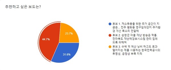 후보에 오른 다른 기사도 지역 사회에 필요한 좋은 기사였다는 평가다. 전북민언련 관계자는 "아쉽게 선정되지 못한 다른 기사에도 많은 관심을 부탁드린다"며 "2021년 2월 이달의 좋은 기사는 3월 2일(화)부터 9일(화)동안 페이스북 안내 등을 통한 시민들의 온라인 투표 결과로 선정했다"고 밝혔다.