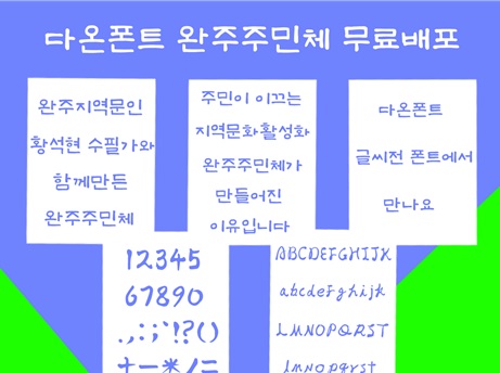 황 작가는 "완주주민체 서체는 다온폰트 글씨전폰트 코너에서 지역문화를 사랑하는 누구나 무료로 내려 받을 수 있다. 임베딩과 재배포를 제외한 상업적 사용도 가능하다"고 덧붙였다.