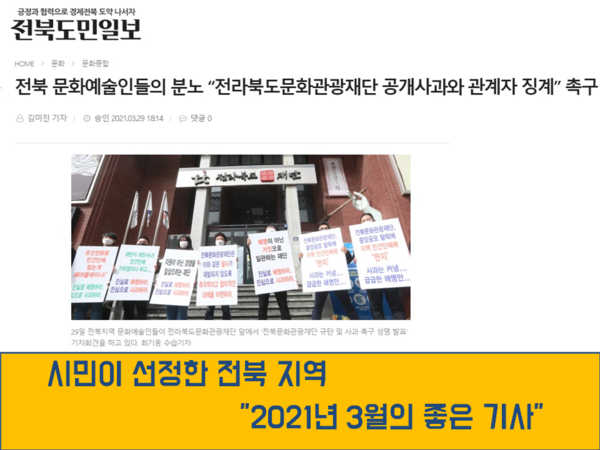 전북도민일보(김미진 기자)가 취재해 보도한 '지역 예술인과 대립하는 전북문화관광재단 비판 여론 집중 보도'가 전북민주언론시민연합(전북민언련)과 시민이 함께 뽑은 '3월의 좋은 기사'에 선정됐다.