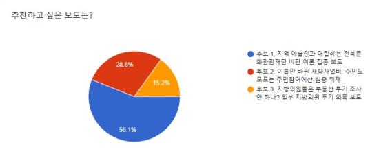 전북민언련은 3개의 이달의 좋은 기사 후보 중 전북도민일보 김미진 취재기자의 '지역 예술인과 대립하는 전북문화관광재단 비판 여론 집중 보도'가 56.1%로 2021년 3월의 좋은 기사로 선정됐다고 13일 밝혔다.