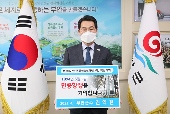 부안군은 권익현 부안군수, 문찬기 부안군 의회 의장, 배의명 부안동학농민혁명기념사업회 이사장 등이 5월 1일 제127주년 동학농민혁명 백산대회를 기념하고 민중항쟁 정신 계승을 위해 동시에 챌린지를 시작했다고 21일 밝혔다.