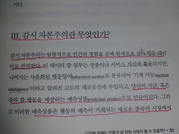 페이스북이나 구굴 등이 단기간에 세계적인 기업으로 성장한 비결이 바로 "감시 자본주의"에 있다는 것이다. 즉 사람들의 경험을 공짜로 추출해 몰래 상업적 행위의 원재료로 이용하여 돈을 벌면서 권력이 되는 새로운 자본주의 체제를 말하는 거 같다.