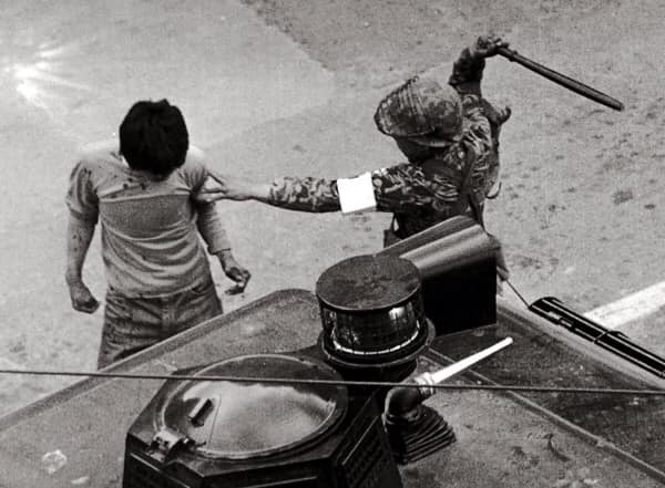 아주 가까이 현장으로 육박해 근접해서 가까이 다가가지 않는다면 찍을 수 없는 사진이다. 설사 비스듬히 높은 장소에서 거리를 두어 망원렌즈를 사용해 포착된 사진이라고 하더라도 저 사진을 찍은 사진 기자의 심리 상태는 병사가 치켜들고 청년의 머리를 향해 내려치는 쇠몽둥이가 결과하는 참혹한 현장의 그 순간에 기자도 같이 있었다는 사실이다.