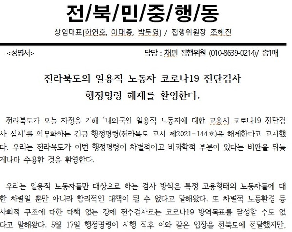전라북도가 오늘 자정을 기해 ‘내외국인 일용직 노동자에 대한 고용시 코로나19 진단검사 실시’를 의무화하는 긴급 행정명령(전라북도 고시 제2021–144호)을 해제한다고 고시했다. 우리는 전라북도가 이번 행정명령이 차별적이고 비과학적 부분이 있다는 비판을 뒤늦게나마 수용한 것을 환영한다.