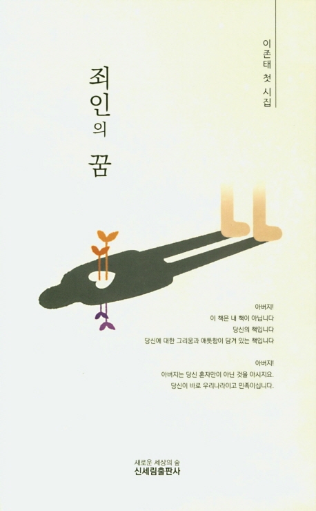 그의 이름은 이존태다. 나이는 76세. 그는 2019년 문단에 등단에 늦깎이 시인이 되었고 2020년 첫 시집 <죄인의 꿈> (신세림출판)을 세상에 내놓았다. 첫 시집에서 어린 시절의 아픔과 외로움, 간계와 속임이 가득한 현실에 대한 분노와 민족 통일에 대한 마음을 절절히 노래했다. 그는 자신의 개인사를 노래하면서도 감정의 노출을 줄이면서 서사적 상황으로 풀어놓았다.