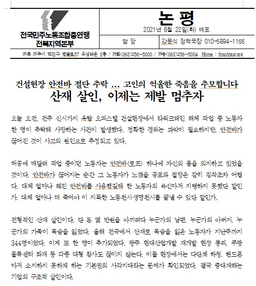 건설현장 안전바 절단 추락 ... 고인의 억울한 죽음을 추모합니다.