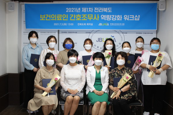 전라북도간호조무사회(회장 최영란)는 지난 3일 전북도회 회의실에서 ‘2021년 전라북도 보건의료인 간호조무사 역량강화 워크숍’을 개최했다. 이날 행사에는 전북간호조무사회 최영란 회장을 비롯해 임직원 10여 명이 참석했다.